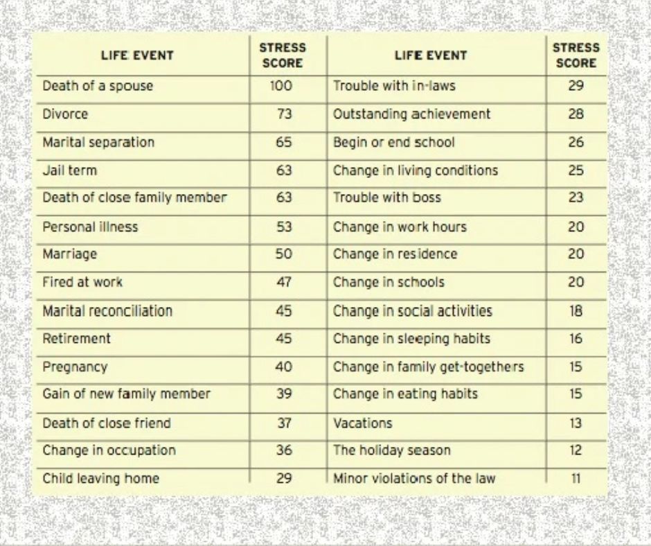 Majority of the events I mentioned above have been listed extremely high on the stress level score, with death of a spouse ranked at 100 points, death of a close family member at 63 points and divorce at equally high 75 points.